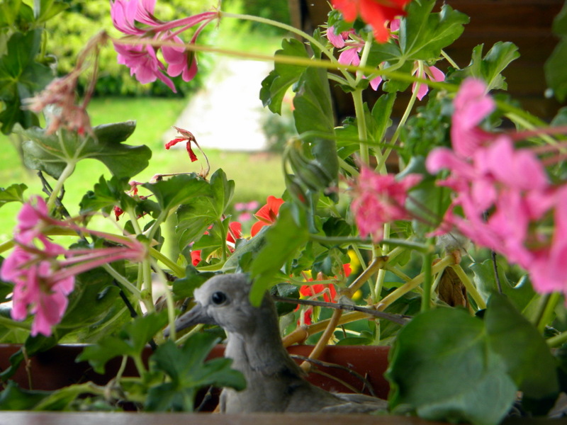 Le couple remarqua alors que ma maison comporte côté ouest une queue-de-geai. C’est une avancée de toit qui protège un balcon, assez courante en Normandie. Mai étant arrivé, j’y avais déjà installé mes jardinières de géraniums-lierres. Sous le toit, plusieurs endroits protégés du vent et de la pluie pouvaient convenir à un jeune couple demandeur d’asile. Si j’avais été une tourterelle, je vois bien où j’aurais emménagé : une belle poutre en L large et bien plate à l’abri des intempéries. Mais je n’ai pas une cervelle d’oiseau. Ma tourterelle imagina de s’installer plutôt dans une jardinière, cassant au passage quelques branches de géranium, cimentant les autres avec deux ou trois brindilles. L’idée ne me plut guère. Toutefois, les débuts catastrophiques de ce jeune ménage m’incitèrent à la clémence. Oubliant ma contrariété de voir mes fleurs abîmées, j’ai décidé de leur signer un bail.